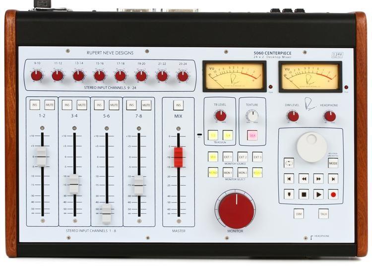 Rupert Neve Designs 5060 Centerpiece - 24-канальный аналоговый микшерный пульт класса А, поддерживающий суммирование каналов. 5060 Centerpiece имеет 2 Silk режима: «Silk Red» и «Silk Blue», которые позволят сделать сведение более насыщенным и плотным. За настройку характера звука отвечает регулировка Texture.